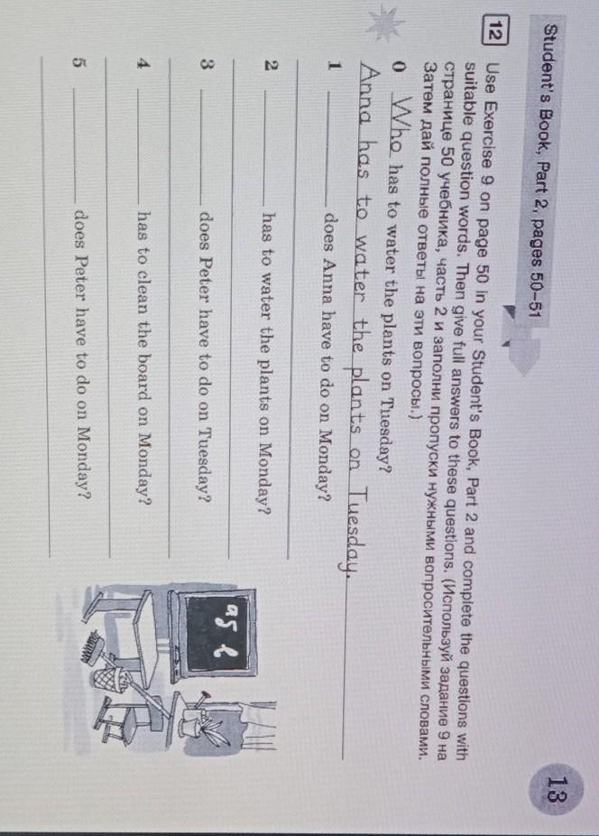 1) What, Anna has to collect the homework on Monday 2)Who, Claire has to water the plants on Monday 3) What, Peter has to clean the board on Tuesday 4) Who, Mark has to clean the board on Monday