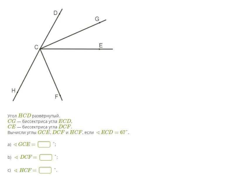 Вычисли углы GCE, DCF и HCF, если ∢ECD=67°.