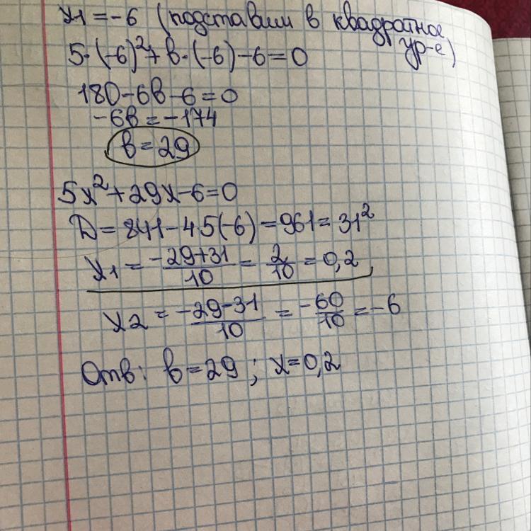 Число -6 є коренем квадратного рівняння 5х²+bx-6=0. Знайти другий корінь і значення b. ТЕРМІНОВО!!!!!!