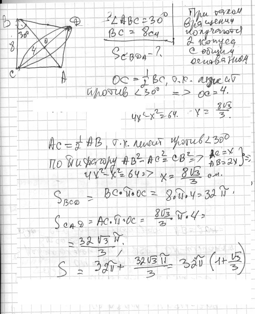 прямоугольный треугольник с катетом 8 см и прилежащим к нему углом 30 градусов вращается вокруг прямой,содержащей гипотенузу.Найдите площадь поверхности полученного тела. Помогите:*