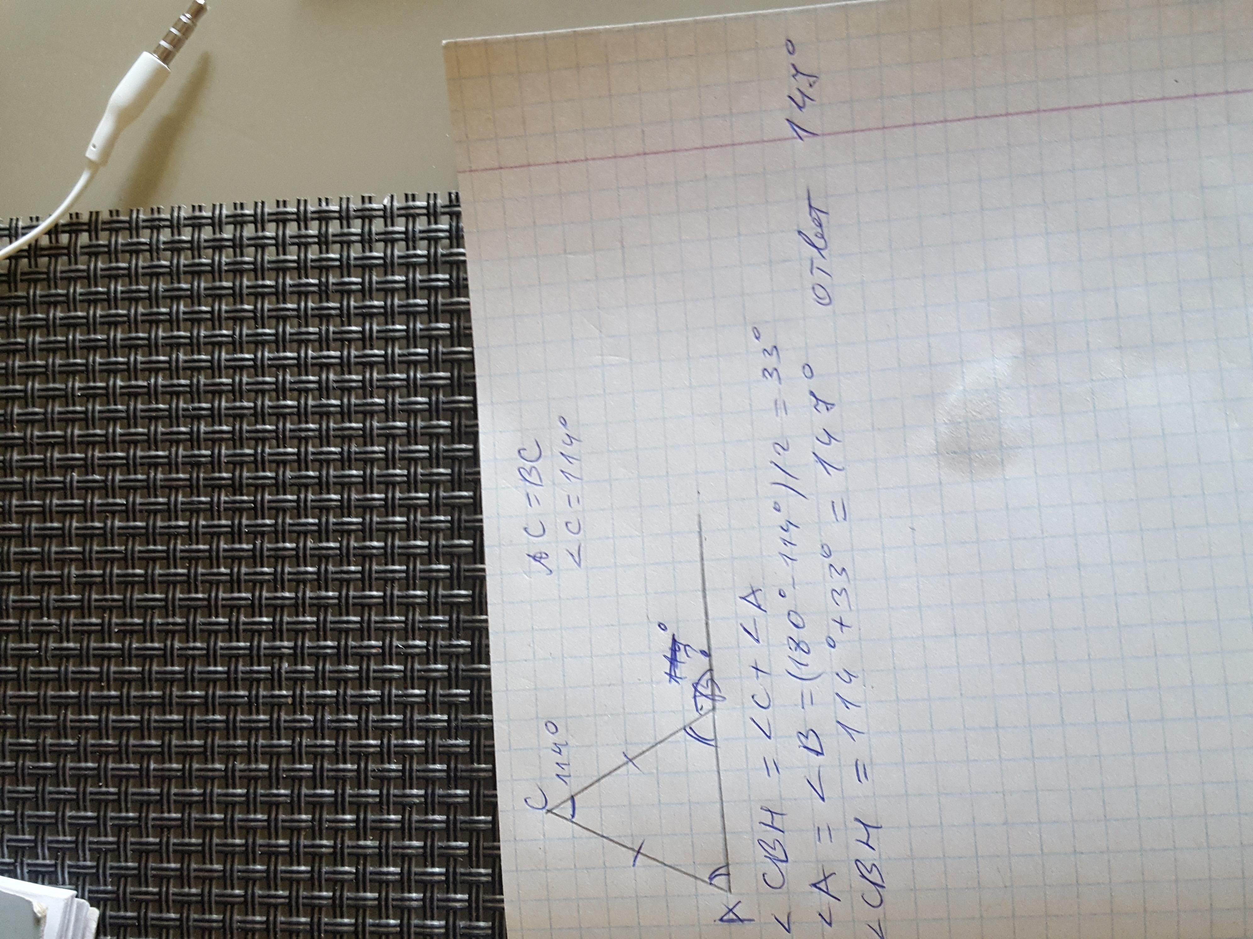 В равнобедренном треугольнике АВС АС = ВС, величина угла С равна 114°. Найдите