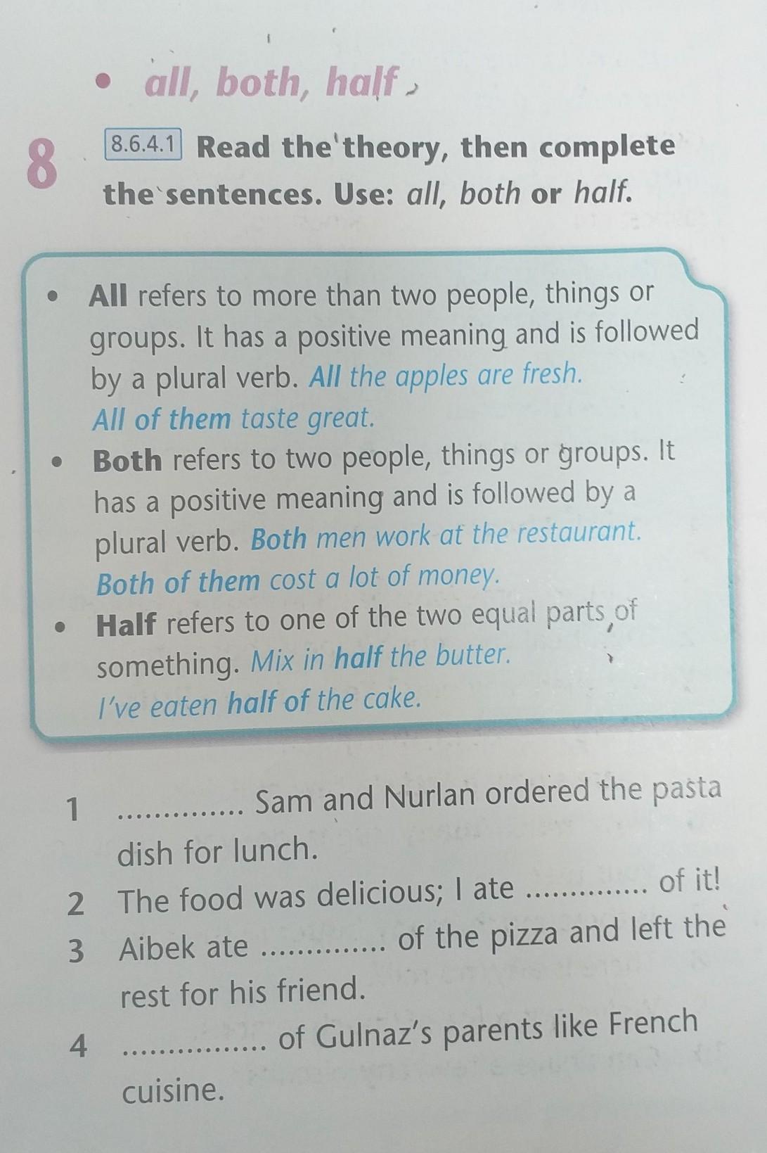Read the theory, then complete the sentences. Use: all, both or half.