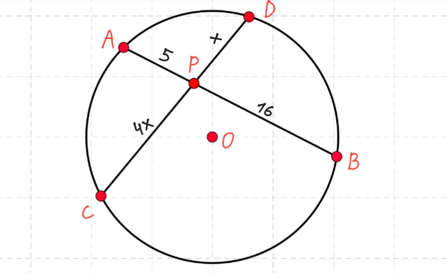 Дано: окружность, О - центр, AB и CD — хорды, AB∩CD= т.Р, АР= 5, ВР= 16, DP= 4CP.