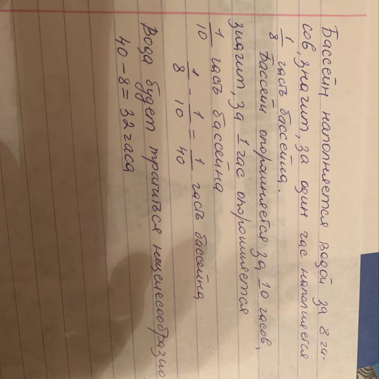 Бассейн наполняется водой за 8 часов, а опорожняется за 10 часов. В результате ошибки в бассейн одновременно наливалась и выливалась вода. За какое время таким образом наполнится бассейн?