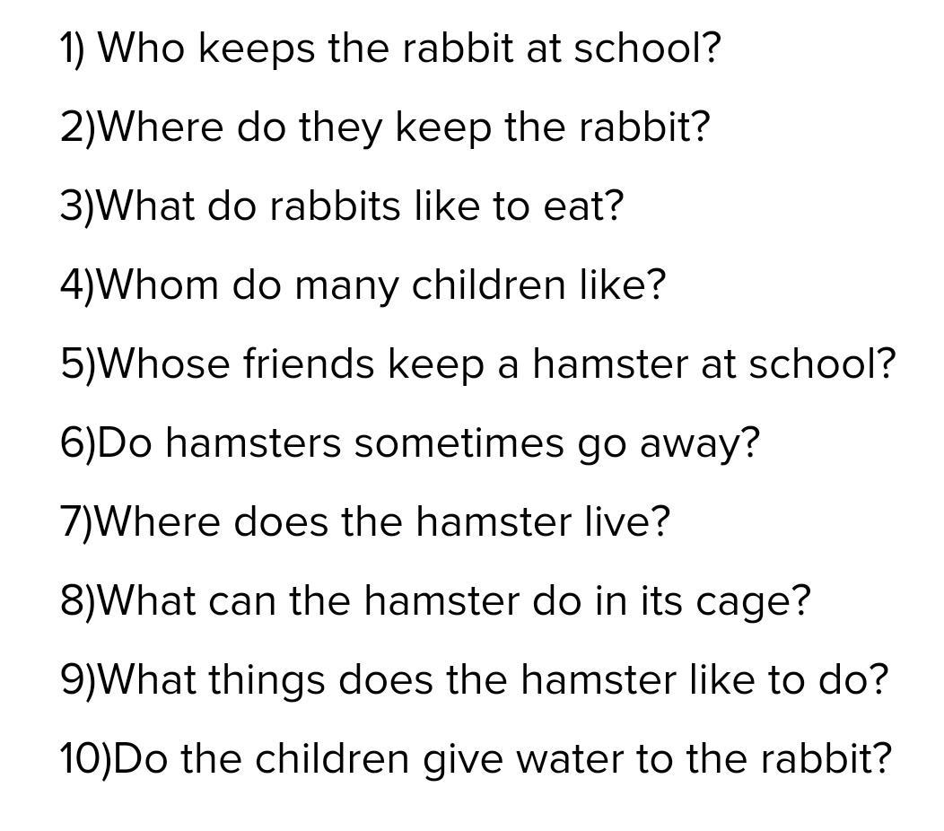 1) We kept a rabbit at home about an year ago.2) We kept it in the cage.3) Rabbits like to eat carrots, cabbages and other vegetables. 4)Many children like hamsters, kittens wnd puppies.5)My friends at school do not keep hamsters.6) Yes, they do. Hamsters go away sometimes.7) The hamster lives in the special cage.8)The hamster can play, eat, drink and sleep in the cage.9) The hamster likes to sleep a lot and itlikes to eat seeds, green leaves and vegetables very much.10l Yes, they do. The children give water to the rabbit.