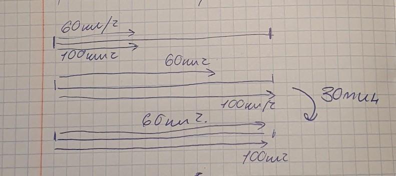 Два автомобиля одновременно движутся из точки А в точку Б,первый автомобиль со скоростью 60км в час,а второй со скоростью 100 км в час.Когда автомобиль со скоростью 100 км в час приехал в точку Б то только через 30 минут приехал автомобиль со скоростью 60 км в час.Вопрос какое расстояние между городом А и Б
