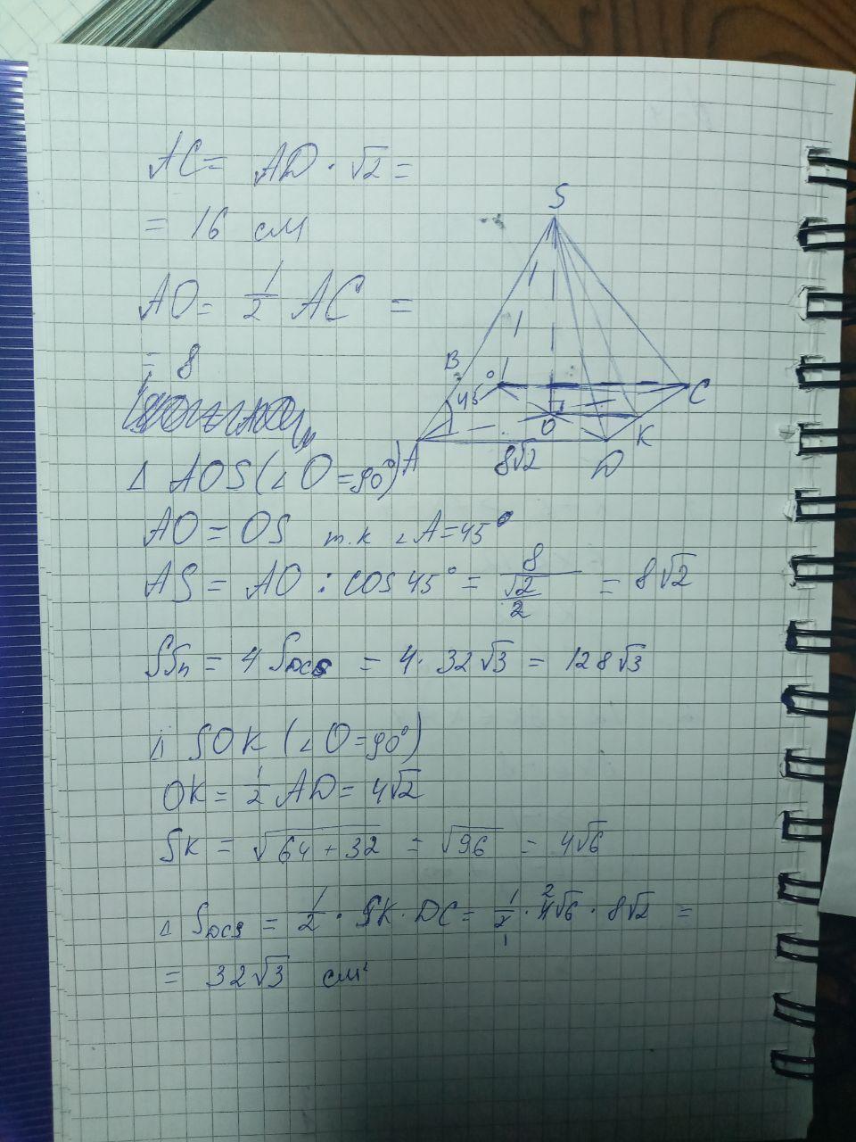 В правильной четырёхугольник пирамиде сторона основания равна 8√2, а угол наклона боковой грани к плоскости основания равен 45°. Найдите боковое ребро пирамиды и площадь её боковой поверхности.