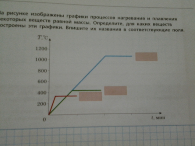 на рисунке изображены графики процессов нагревания и плавления некоторых веществ равной массы.определите,для каких вещесьв построены эти графики.выпишите их названия в соотствующие поля.