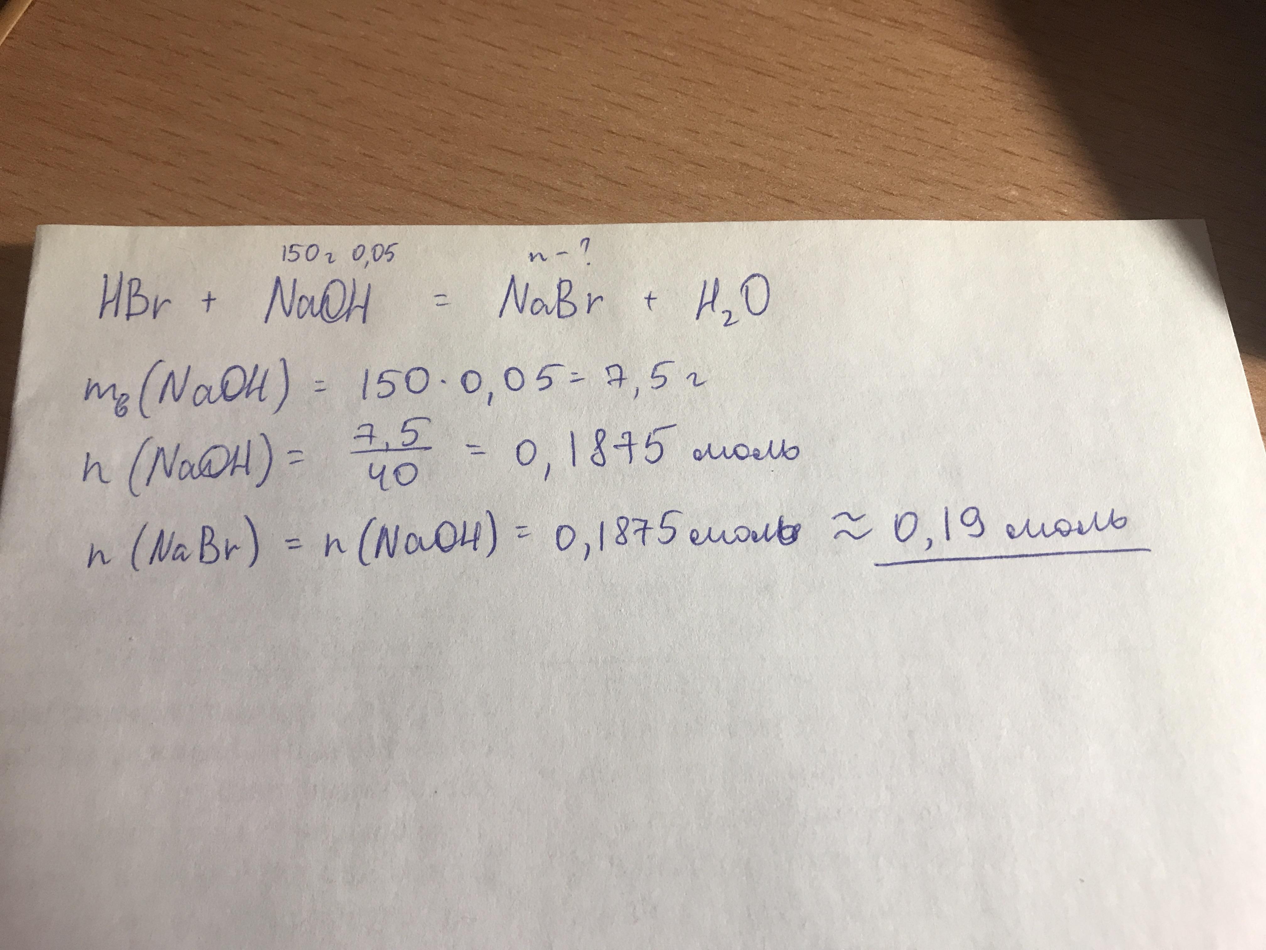 Вычисли химическое количество соли, образовавшейся при взаимодействии бромоводородной кислоты и 150 г раствора гидроксида натрия с массовой долей NaOH, равной 0,05.