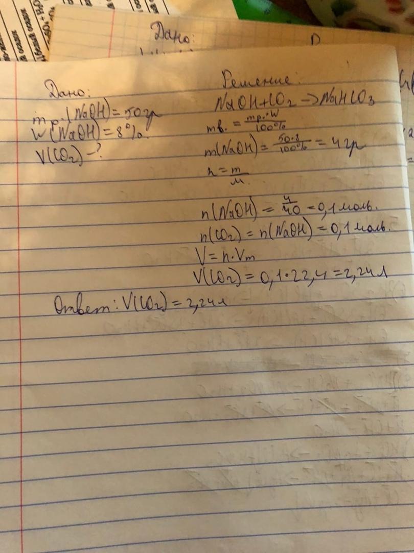 РЕБЯТА ПОМОГИТЕ ПОЖАЛУЙСТА!!! Через 50г раствора гидроксида натрия с массовой долей 8% пропустили углекислый газ до образования гидрокарбоната натрия. Вычислите объем затраченного на реакцию газа