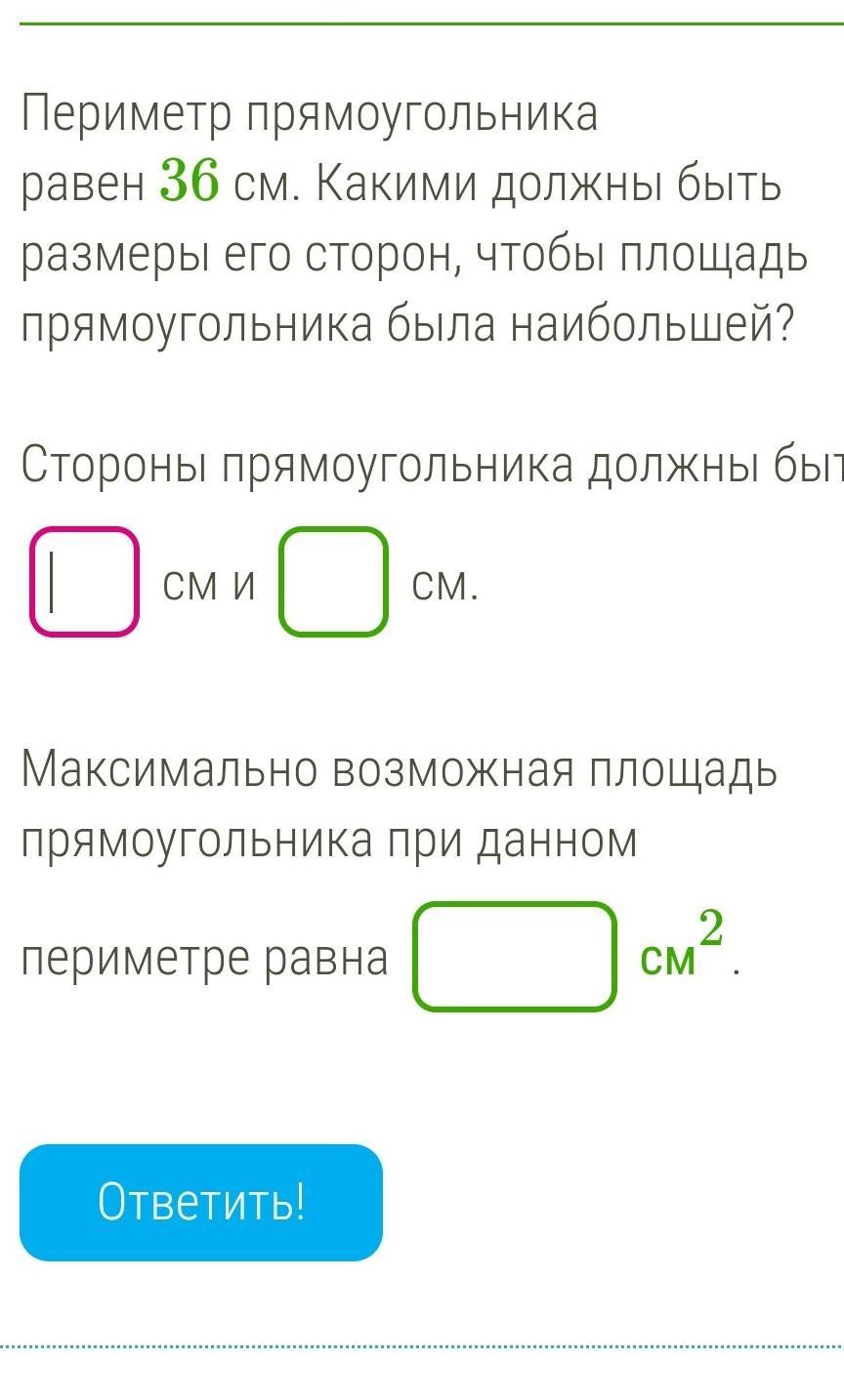Мы доказали, что для заданного периметра пр-ка самую большую плошадь имеет КВАДРАТ. Его площадь: S = 9² = 81 см²