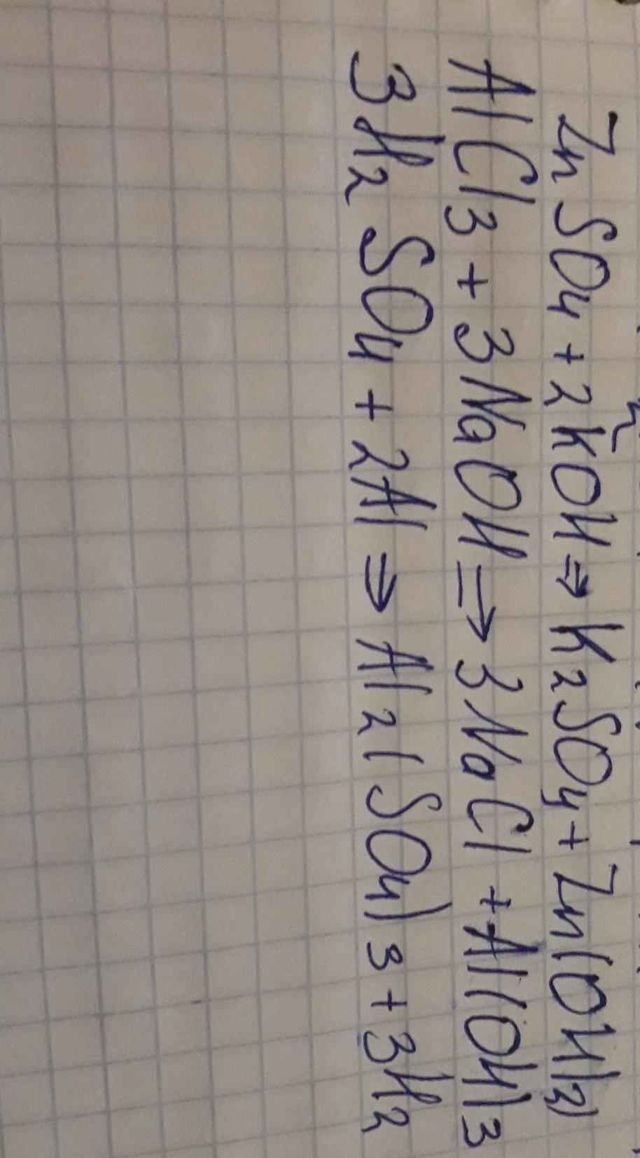 Перетворити схему химической реакции на химическое уравнение: ZnSO4+KOH=K2SO4+Zn(OH)2, AICI3+NaOH=NaCI+AI(OH) 3, H2SO4+AI=AI2(SO4)3+H2.Химия