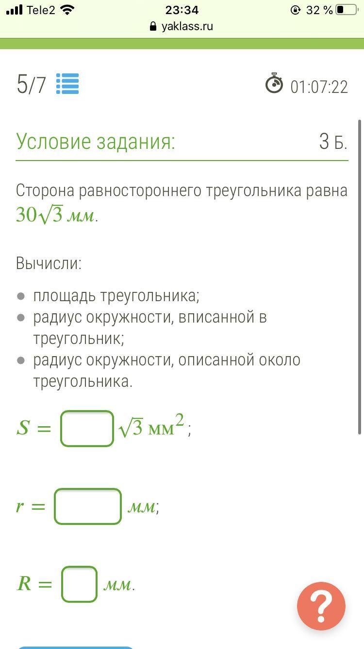 Если обозначить сторону равностороннего треугольника через a, то его площадь , радиус окружности вписанной в треугольник