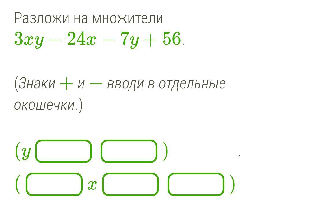 3ху-24х-7у+56=3х(у-8)-7(у-8)=(у-8)(3х-7)