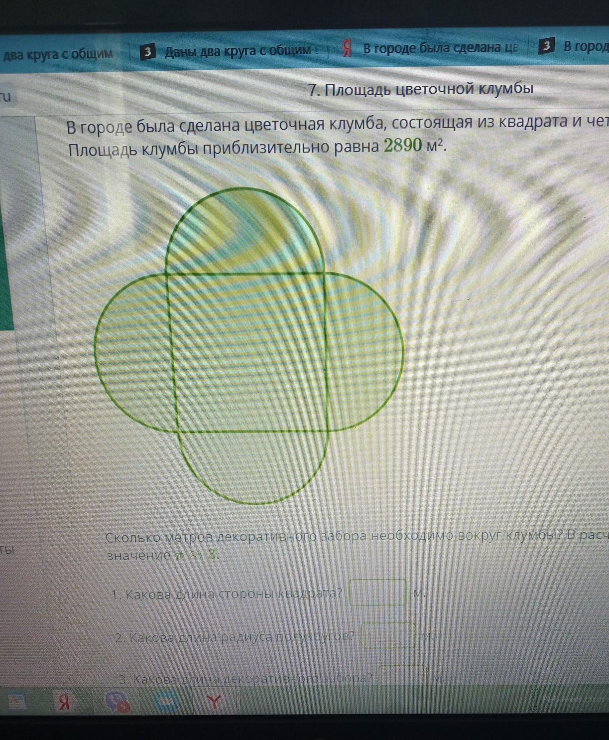 в городе была сделана цветочная клумба ,состоящая из квадрата и четырех полукругов .Площадь клумбы приблизительно ровна 2890м². Сколько метров декоративного забора необходимо вокруг клумбы? в расчётах использован округленное значение п=3 1) какова длина стороны квадрата? 2) какова длина радиуса полукругов? 3) какова длина декоративного забора?