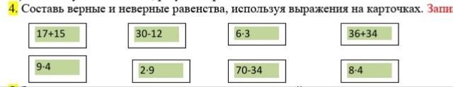 Ответ:17+15 и 8×4, будет 32; 70-34 и 9×4, будет 36; 30-12 и 2×9, будет 18;