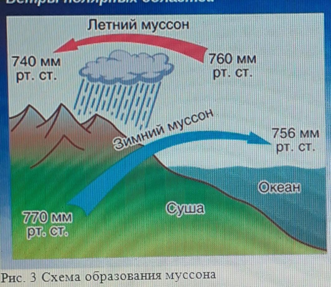 Летом муссоны, возникающие из-за зон низкого давления над континентом, приносят с моря влажные ветры, а зимой, наоборот, возникая из-за высокого давления над сушей, муссоны приводят к образованию сухих ветров, дующих с континента. В течение лета большие территории Азии нагреваются солнцем. Воздух над этими областя ми увеличивается в объеме и поднимается вверх, образуя зоны низкого давления. Затем влажные ветры с моря дуют на эти территории, принося летние муссоны. Зимой ситуация обратная — над сушей образуются зоны высокого давления, и зимние муссон-ные ветры дуют к морю. Пути этих ветров отклоняются под действием кориолисовой силы.