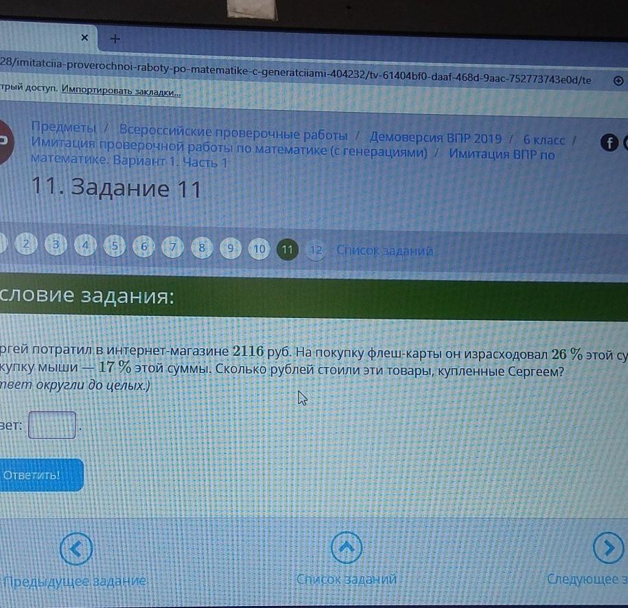 сергей потратил в интернет магазине 2116 руб. на покупку флеш-карты он израсходовал 26% этой суммы, а на покупку мыши 17% этой суммы. сколько рублей стоили эти товары купленные Сергеем?
