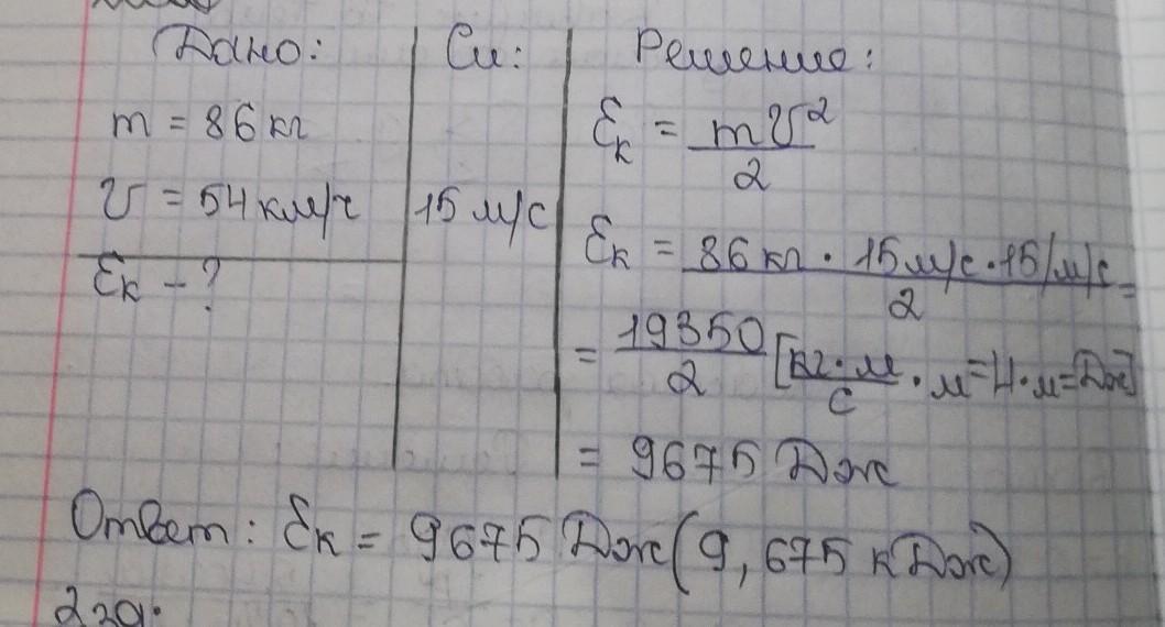 1. Какой кинетической энергией обладает велосипедист, масса которого вместе с велосипедом составляет 86 кг, а скорость движения равна 54 км/ч?