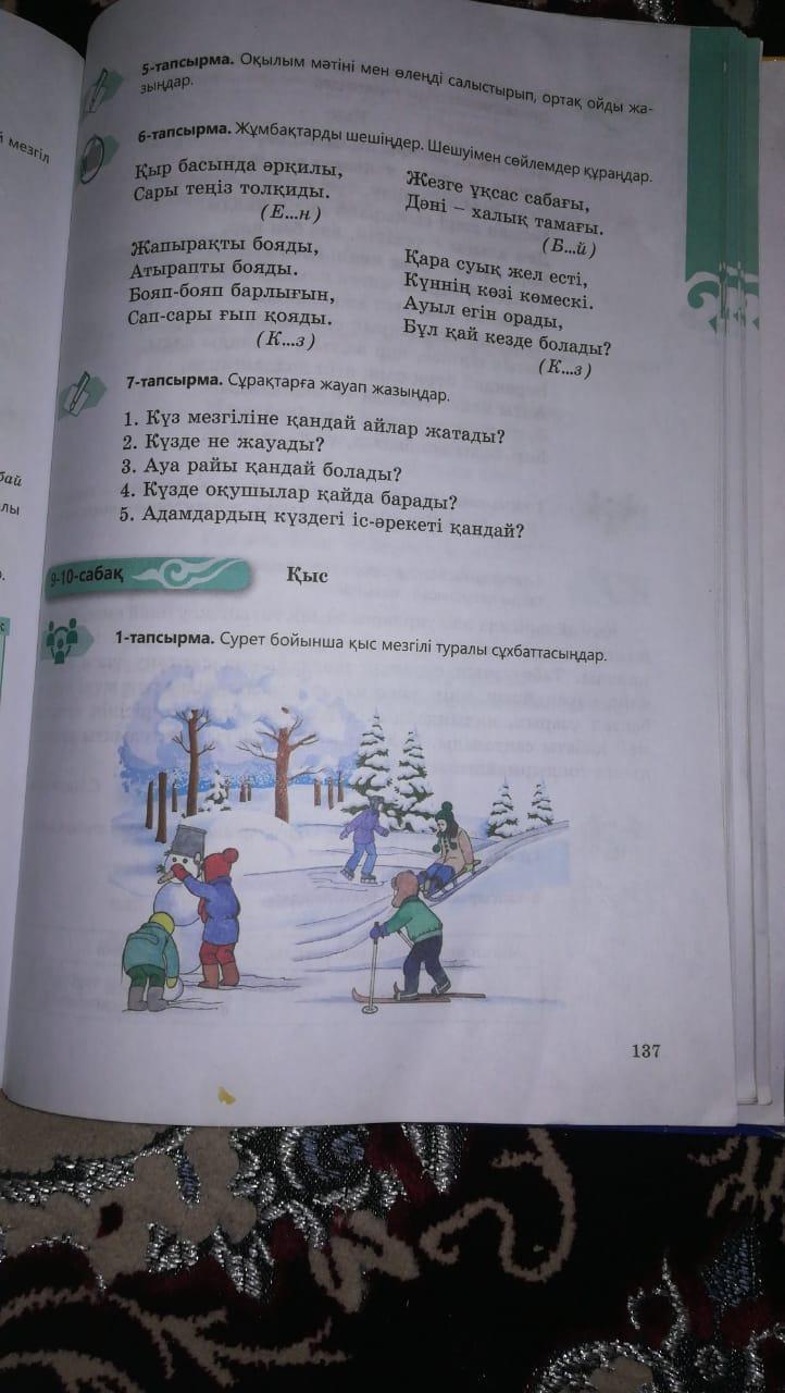 Ответ:Сурете қыс мезгілі бейнелеген. Балалар асыр салып орнап жүр . Инабат пен Аибек аққала жасап жатыр .Нурбек шаңғы тебіп жүр . Кенжебек коньки тебіп жүр . Сымбат шана мен асырғаннан жүр .Бұл ең керемет демалыстардың бірі