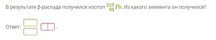 2 Заряд материнского ядра на 1 меньше дочернего. Находим заряд материнского ядра 84−1 = 83. Записываем заряд 83 перед обозначением ядра снизу.