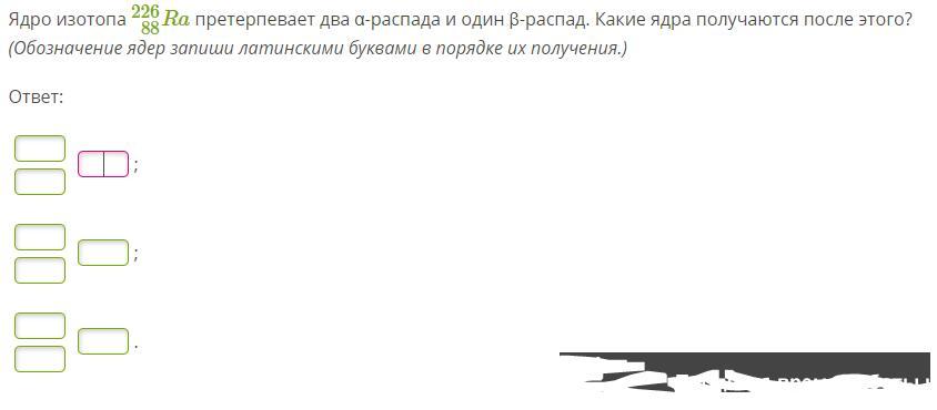 Ядро изотопа Ra претерпевает два α-распада и один β-распад. Какие ядра получаются после этого? (Обозначение ядер запиши латинскими буквами в порядке их получения.)