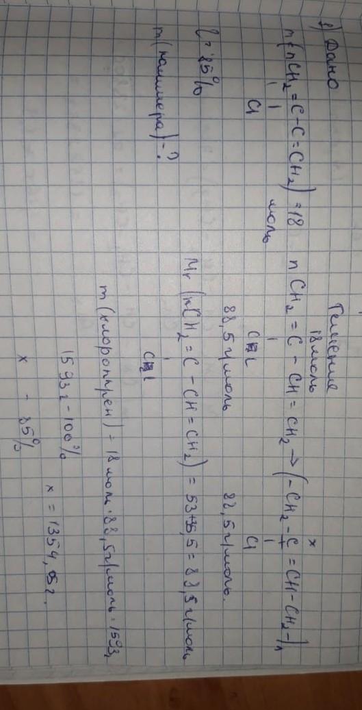 Хлоропрен (2-хлорбутадиен-1,3) легко полимеризуется, образуя хлоропреновый каучук. напишите схему полимеризации хлоропрена . определите массу полимера, полученного из 18 моль хлоропрена с выходом 85%