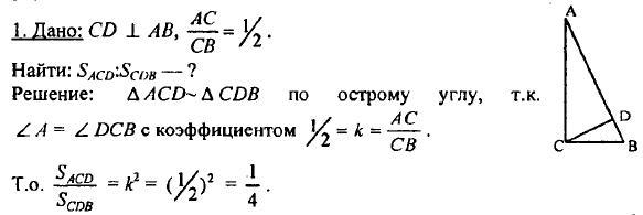 В прямоугольном треугольнике ABC (угол С=90 градусов) CD перпендикулярна АВ; отношение АС СВ равна отношению 1 к 2. Найти отношение площадей треугольников ACD и CDB.