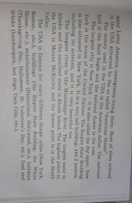 там живет много иммигрантов из Латинской Америки. Большинство из них прибыли в США, привлеченные так называемой «американской мечтой». Деньги, используемые в США, - американский доллар. Национальная птица - белоголовый орлан, национальный цветок - роза. Самый большой город Нью-Йорк - его также называют Большим яблоком. Нью-Йорк является домом Организации Объединенных Наций. Эмпайр Стейт Билдинг также находится в Нью-Йорке. Это очень высокое здание, 443,2 метра, включая антенну, и очень красивое. Самая длинная река - река Миссисипи. Самый большой штат Аляска, а самый маленький штат Род-Айленд. Самая высокая точка в США - гора Мак-Кинли, а самая низкая - в Долине Смерти. США славятся многими разными вещами: города (Нью-Йорк, Бостон и т. Д.), Здания (Эмпайр Стейт Билдинг, Белый дом и т. Д.), Развлечения (Диснейленд, Голливуд и т. Д.), Праздники (День благодарения, Хэллоуин, День святого Валентина и т. Д.), Еда и напитки (гамбургеры, хот-доги, кока-кола и т. Д.).