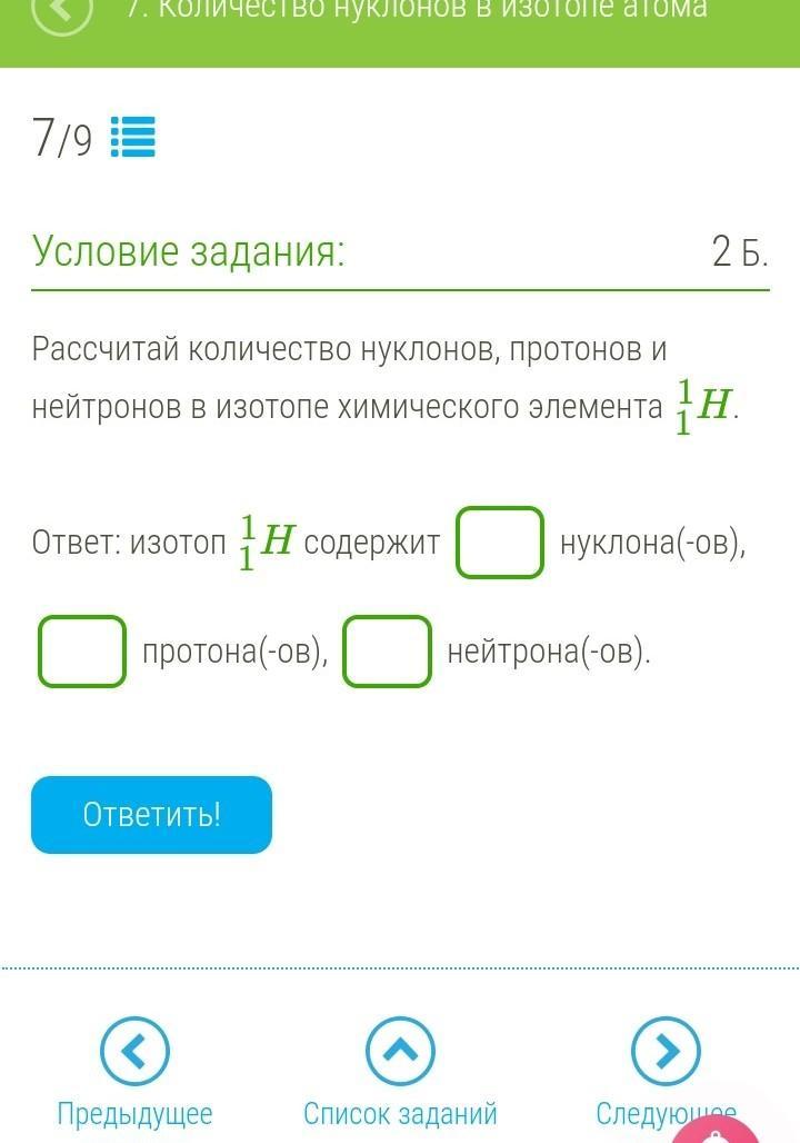 Рассчитай количество нуклонов, протонов и нейтронов в изотопе химического элемента H11.