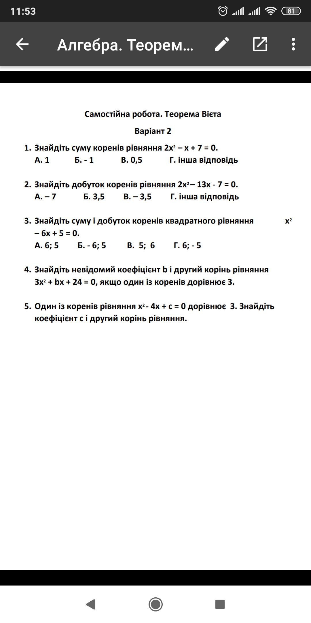 1.А, т.к. по теореме Виета сумма равно х1+х2=-в.(в вашем случае в=-1)