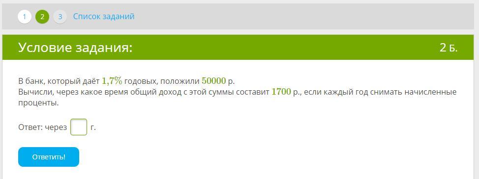 Вычисли, через какое время общий доход с этой суммы составит 1700 р., если каждый год снимать начисленные проценты.