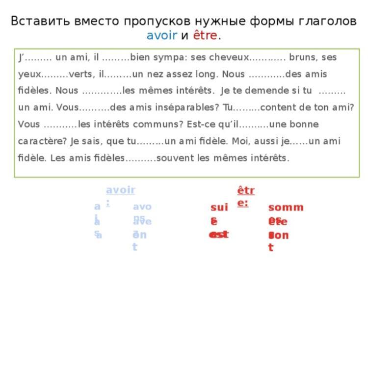 Ответ: 1. j'ai, il est, sont bruns, sont verts, il a. Nous sommes. Nous avons. Tu as. Vous etes. Tu es. Vous avez. Il a. Tu es. Suis. Ont.