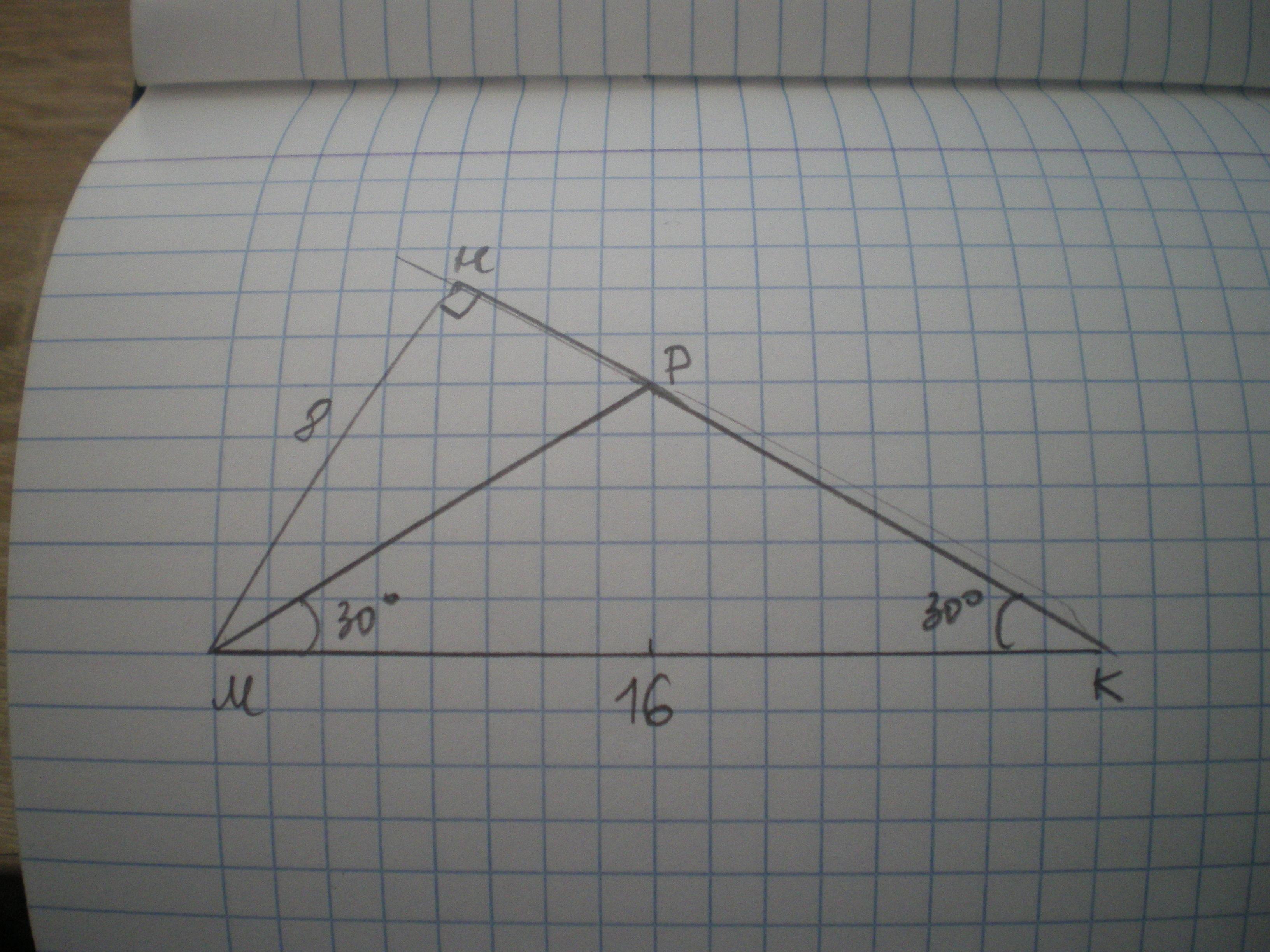 Рассмотрим ΔКМН - прямоугольный. ∠К=30°, значит МН=1/2 МК по свойству катета, лежащего против угла 30°. МН=16:2=8 см.