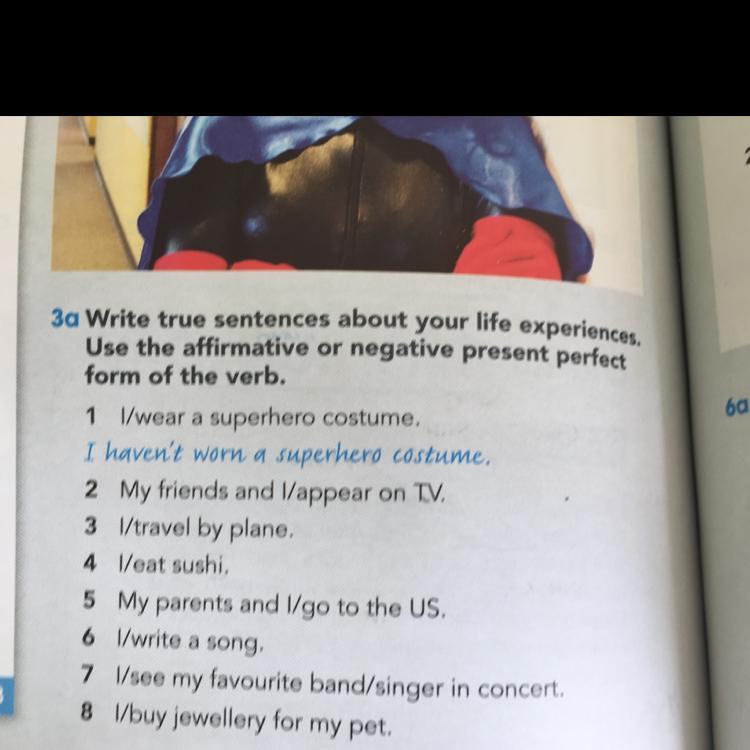 Смотри там написано предложение- я насильно супер геройский костюм, тебе нужно написать правду из жизни если ты не носил его то пиши как в премере не носил