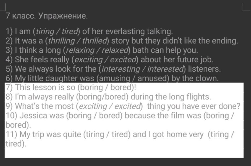 Ответ: 1) tired 2)thrilling 3)relaxing 4)excited 5)interesting 6)amused 7)boring 8)bored 9)exciting 10)bored 11)tiring