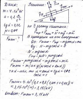 автомобіль масою 4 тони рухається на гору сповільнюючи свій рух.Визначте силу тяги автомобіля якщо ухил гори становить 0,02 а коефіцієнт опору рухові 0,04,Прискорення автомобіля 0,15 м