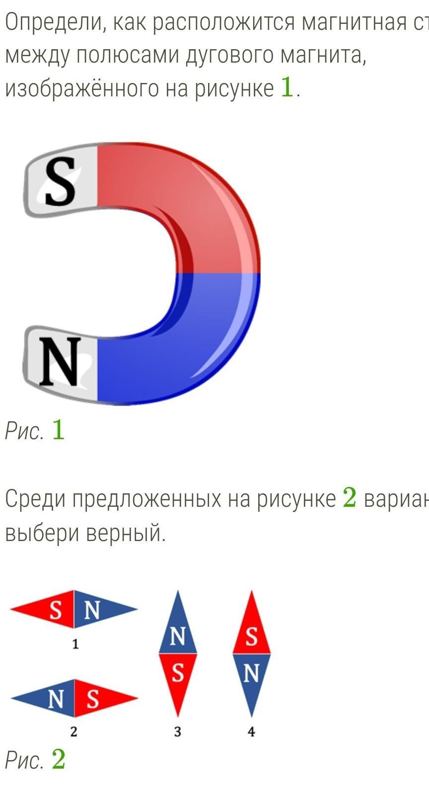 Определи, как расположится магнитная стрелка между полюсами дугового магнита, изображённого на рисунке 1.