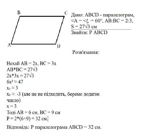Гострий кут паралелограма дорівнює 60 градусів а сторони пропорційни числам 2 і 3. Знайдіть периметр паралелограма якщо площа дорівнює 27 корень3 см в квадрате? Срочно!!!!