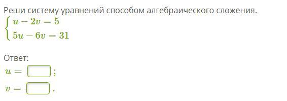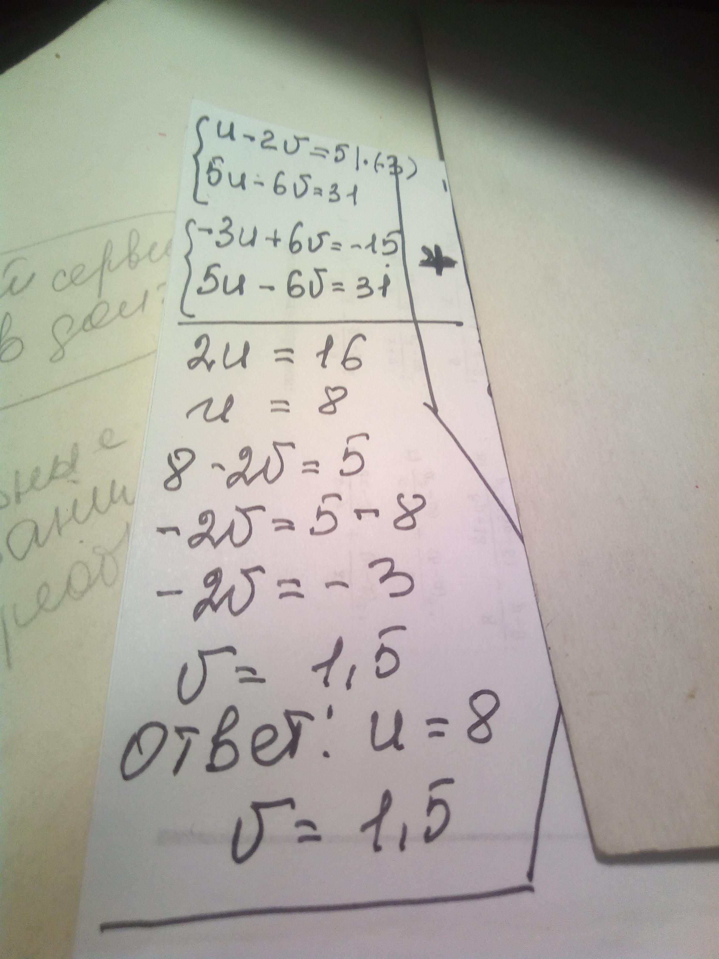 Объяснение:Решим систему способом сложения: 1-ое уравнение умножим на (-3), тогда -3U+6V=-15, сложим его почленно со 2-м уравнением, получим: 2U=16,⇒ U=8, тогда 8 - 2V=5, 2V=3, V=1,5