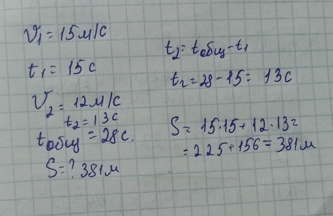 12 метров в секунду · (28 секунд - 15 секунд) = 12 метров в секунду · 13 секунд = 156 метров.