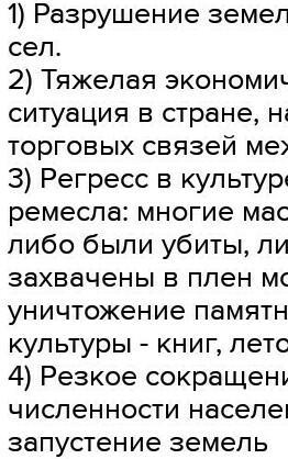 ; политич., культурные. Распределить по графам факты: (сокращение населения, уничтожение ремесел, разрушение памятников архитектуры, уничтожение летописей, икон, приостановлено каменное строительство, упадок городов, упадок сельского хозяйства, резкое сокращение численности городского населения