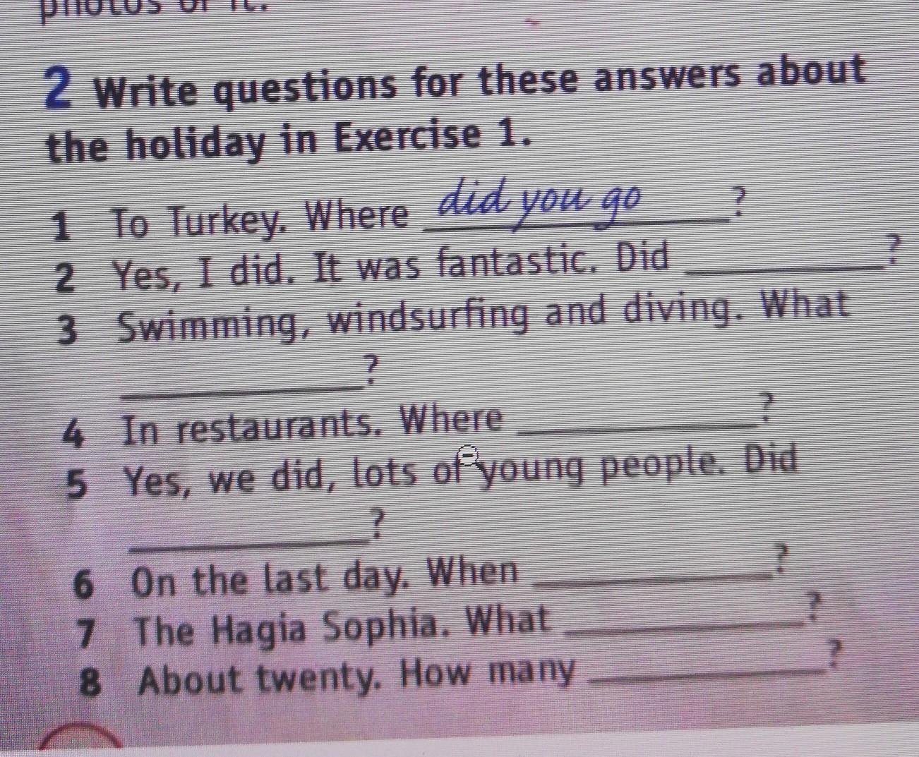 задание звучит так : Напишите вопросы к ответам про каникулы с упражнения 1.