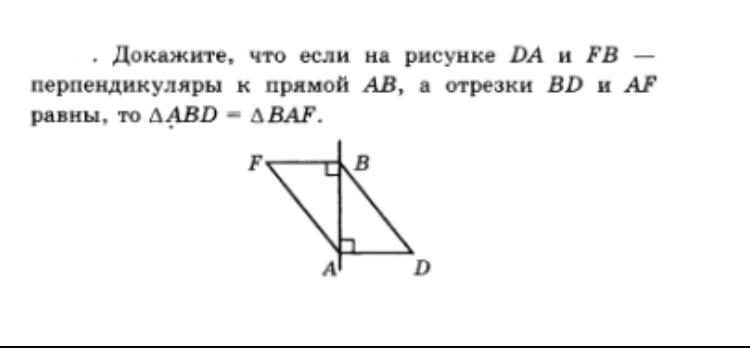 Докажите,что если на рисунке DA и FB Перпендикулярны к прямой АВ а отрезки BD u AF равны,то ABD=BAF