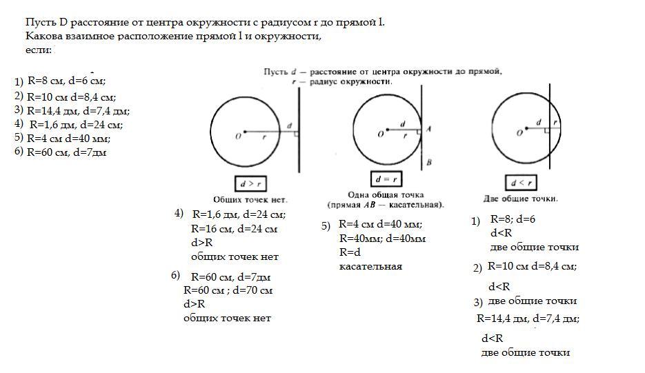 Пусть D расстояние от центра окружности с радиусом r до прямой l. Какова взаимное расположение прямой l и окружности, есле: R=8 см, d=6 см; R=10 см d=8,4 см; R=14,4 дм, d=7,4 дм; R=1,6 дм, d=24 см; R=4 см d=40 мм; R=60 см, d=7дм?