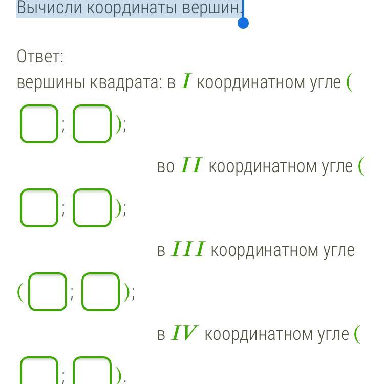 Квадрат со стороной = 8 расположен так, что центр его находится в начале координат, а стороны параллельны осям координат. Вычисли координаты вершин.