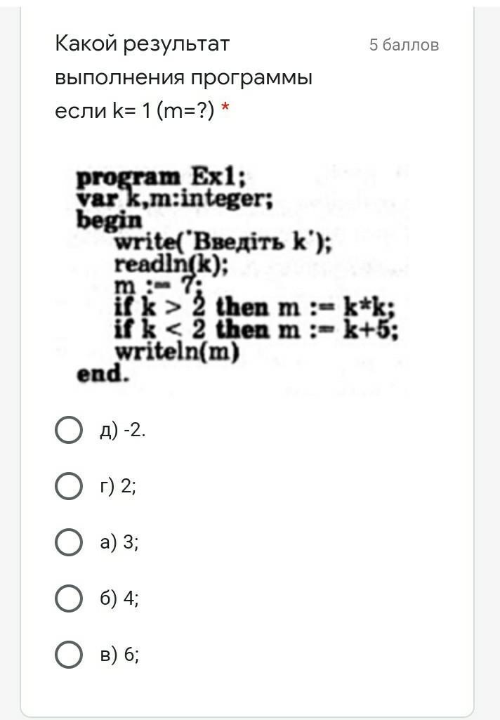 Объяснение: Так как k=1, следовательно if k<2, then m:=k+5=1+5=6.