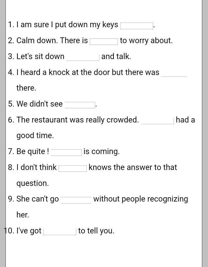 нужно вставить: SOMEWHERE, ANYWHERE, NOWHERE, EVERYWHERE, SOMETHING, ANYTHING, NOTHING, EVERYTHING, SOMEBODY, ANYBODY, NOBODY, EVERYBODY!