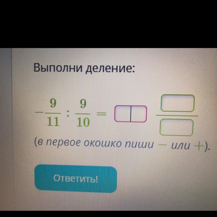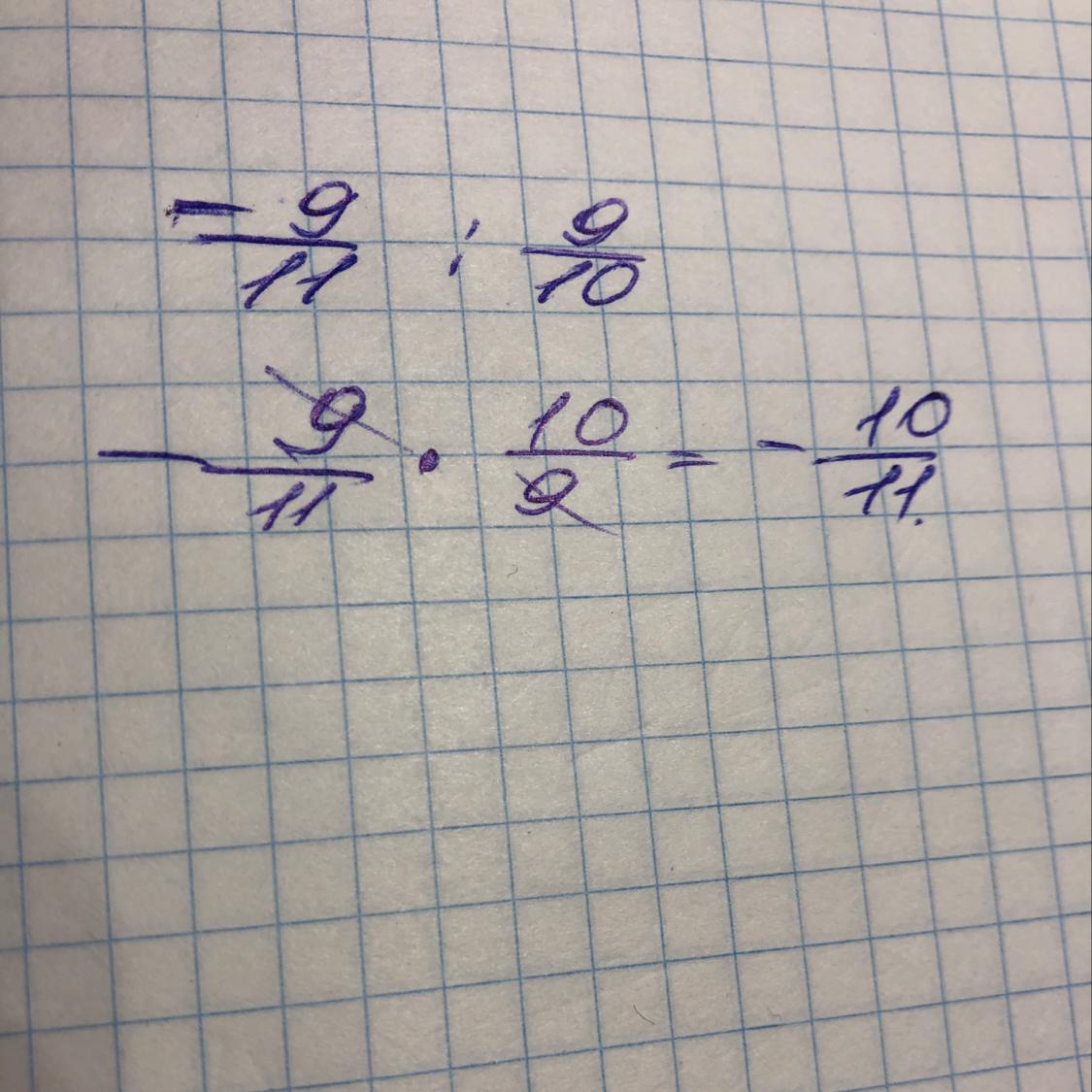 Тоесть : -9/11:10/9= - (9/11×10/9) = - (1/11×10/1) = - 10/11