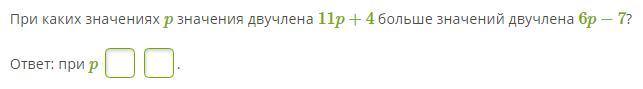 При каких значениях p значения двучлена 11p+4 больше значений двучлена 6p−7?